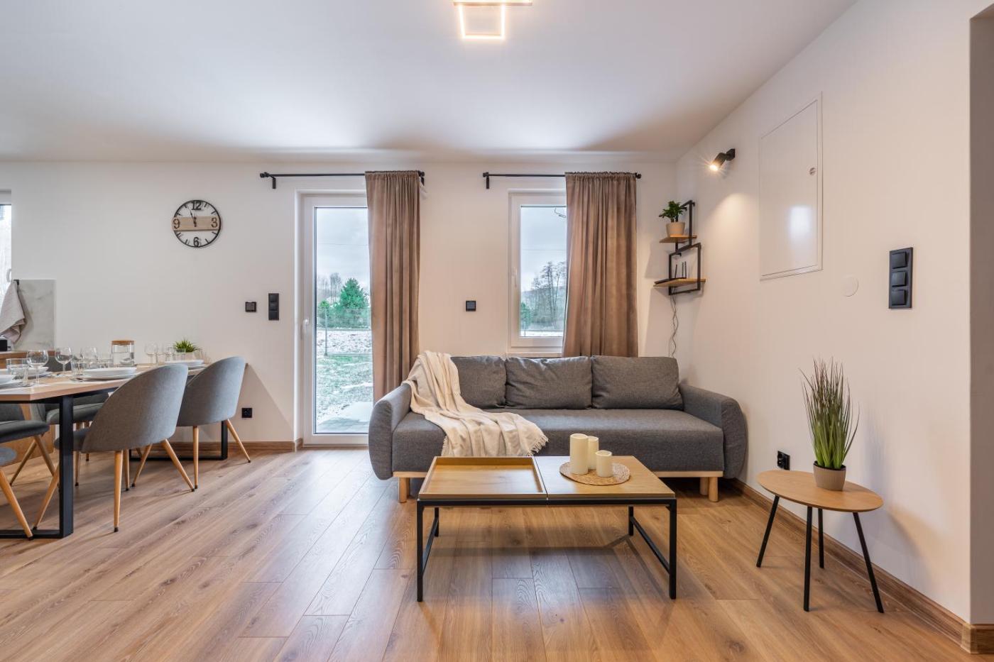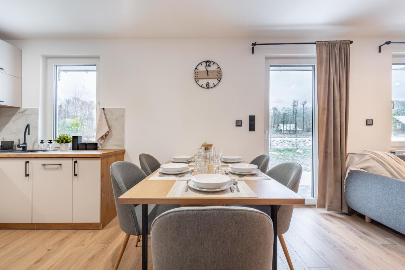 Dom z 2 sypialniami. In the well-fitted kitchen, guests will find a stovetop, a refrigerator, a dishwasher and kitchenware. The air-conditioned holiday home offers a flat-screen TV with streaming services, a private entrance, a tea and coffee maker, a dining area as well as garden views. The unit offers 5 beds. Dom wakacyjny - 8 osobowy. Powierzchnia pokoju ok.: 65 mkw.