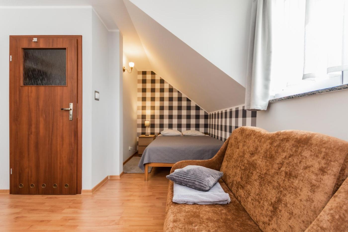 Domek. This chalet includes 1 living room, 1 separate bedroom and 1 bathroom with a bath. This chalet offers a wardrobe and a flat-screen TV. The unit has 4 beds. Domek - 4 osobowy. Powierzchnia pokoju ok.: 25 mkw.